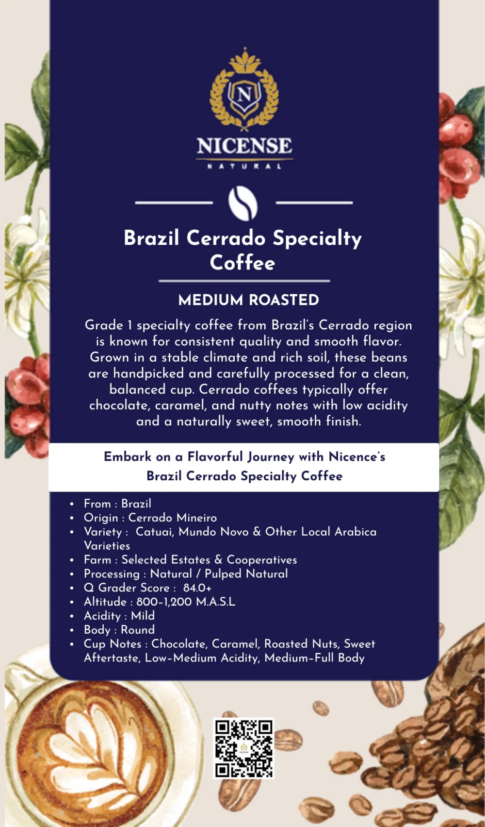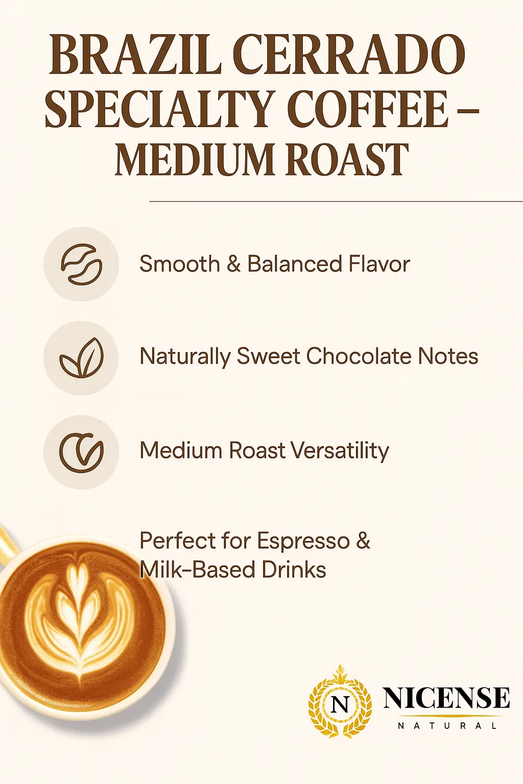 Nicense Brazil Cerrado Specialty Coffee – Medium Roast | Grade 1 Arabica Beans | Chocolate, Caramel & Nutty Notes | Natural/Pulped Natural Process | Smooth & Low Acidity