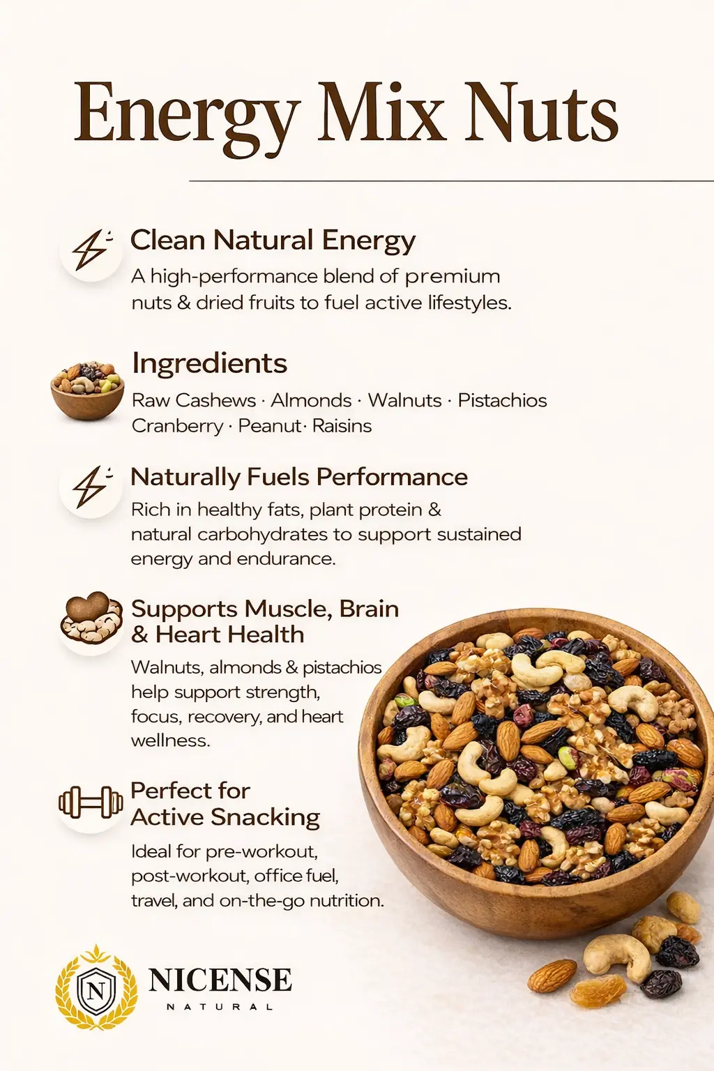 Whether you’re powering through a busy workday, enjoying a pre- or post-workout snack, or looking for a nutritious option for travel and gifting, NICENSE Energy Mix Nuts is the perfect choice for mindful, everyday snacking.