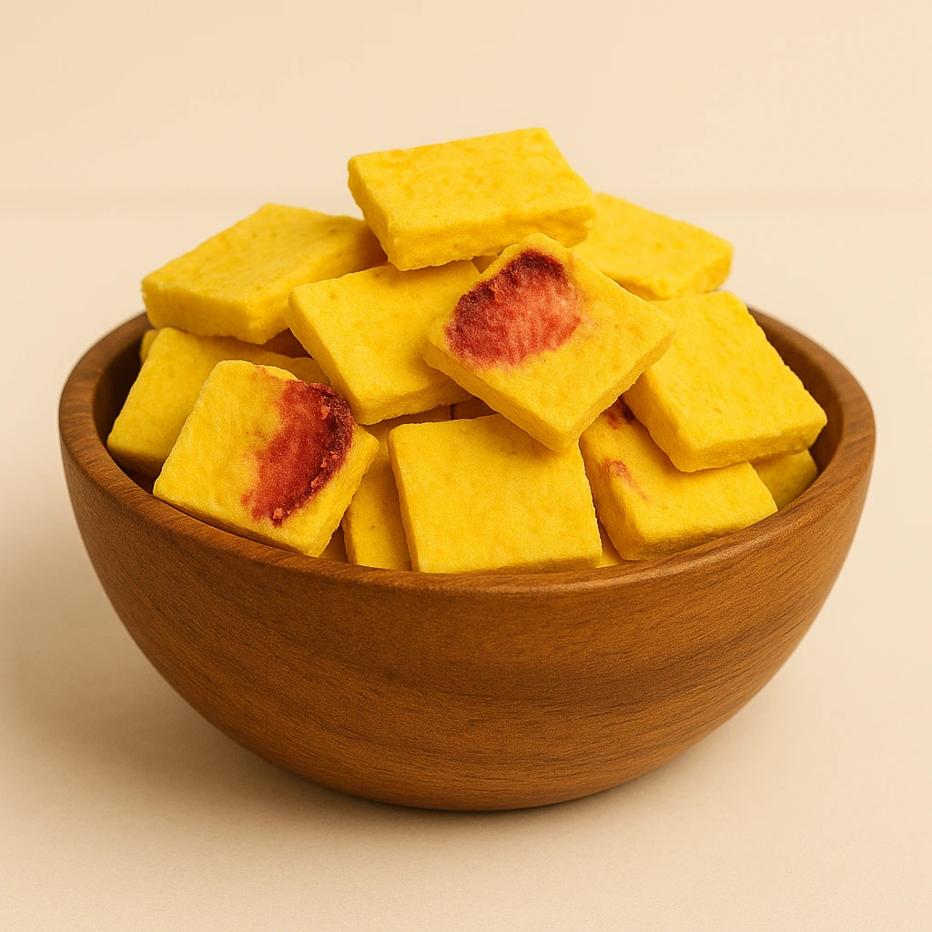 Made from real mango-flavoured ice cream infused with natural strawberry pieces, each bite gives a burst of sweet mango creaminess balanced with fruity strawberry tang. Freeze-dried to lock in flavour, colour, and texture, this snack stays crispy, airy, and melt-in-your-mouth without refrigeration.